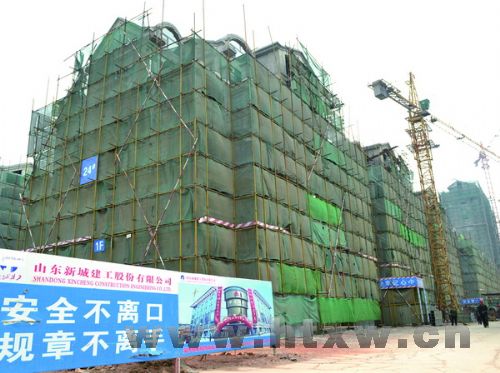 新城建工青岛分公司李卫东项目部承建的平度市上城府第高档住宅社区,占地面积27.4公顷,总建筑面积43万平方米。目前该项目主体基本完工,进入装饰装修阶段。图为施工现场。 (张晓明 周敬滨 摄)