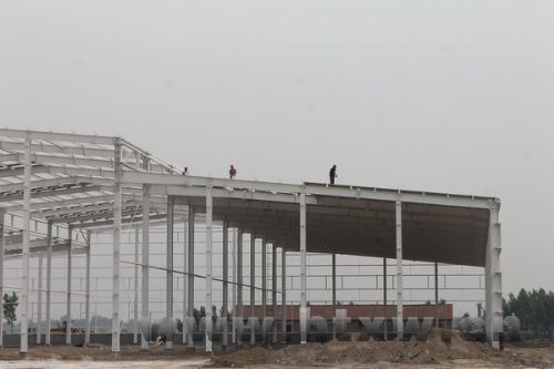 近日,记者来到位于索镇的淄博振兴包装有限公司看到,工人们正在高20多米的车间框架顶部忙碌着,远处挖掘机、拖拉机等机械来回穿梭。