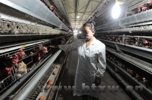 位于果里镇的淄博丙河养殖场在持续加大投入的基础上,不断提高鲜蛋生产自动化水平,大大降低了工人劳动强度,提高了产蛋量,目前,日产日销鲜蛋超过4吨,连续多年保持全市蛋鸡养殖最大规模。图为工人在自动化蛋鸡养殖车间查看喂料产蛋情况。 (成国栋 田尧 摄)