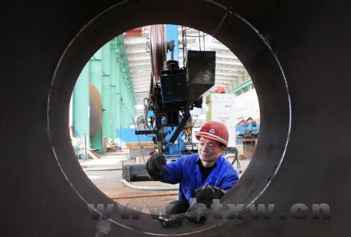 近年来,山东鑫昊特种装备股份有限公司不断创新,加大自主研发设计力度,产品销往全国各地,是鲁中地区规模最大的压力容器制造厂家。2013年,公司销售收入同比增长20%。图为工人利用埋弧焊机进行焊接作业。