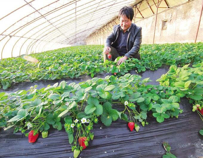 位于唐山镇郑家村的世外桃源生态园采用富含有机质的肥料和沼液改良土壤,引进优质草莓品种进行种植。据了解,该品种草莓年产量约3500斤/亩,具有柔嫩多汁、芳香味浓等特点。今年,该生态园的6个大棚草莓较往年提前半个月上市。图为农户正在管护草莓。(李凯 摄)