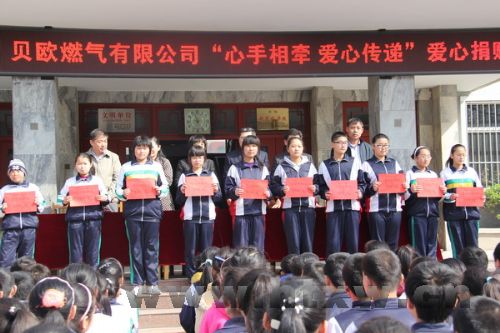 3月18日,淄博绿博、贝欧燃气有限公司在唐山中学举行了“心手相牵、爱心传递”爱心捐赠活动。 淄博绿博、贝欧燃气有限公司向唐山中学捐赠了价值2万余元的款物,资助困难优秀团员10名,每人资助现金300元,向学校赠送2万余元的图书。