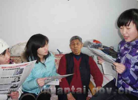 云涛社区杨凤祥老人,是一名老党员。身体壹级残疾,无法出门,整天在家不是坐着就是躺着,生活很是郁闷。社区志愿者定期去和他聊天,为他送去精神食粮,让他足不出户就能了解到天下事。这不志愿者又为他解读党的十八精神,看杨大爷听的多么认真。