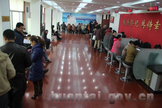 12月12日9:00,记者来到县婚姻登记处,看到门口摆满了车辆。上楼时遇到了两对刚领了结婚证下楼的夫妻,脸上洋溢着幸福的微笑。照片室门前几对新人在排队等待,颁证大厅一旁的休息椅上坐满了等待叫号的情侣。县婚姻登记处的工作人员,叫号、收费、发表、盖章,一切井然有序。