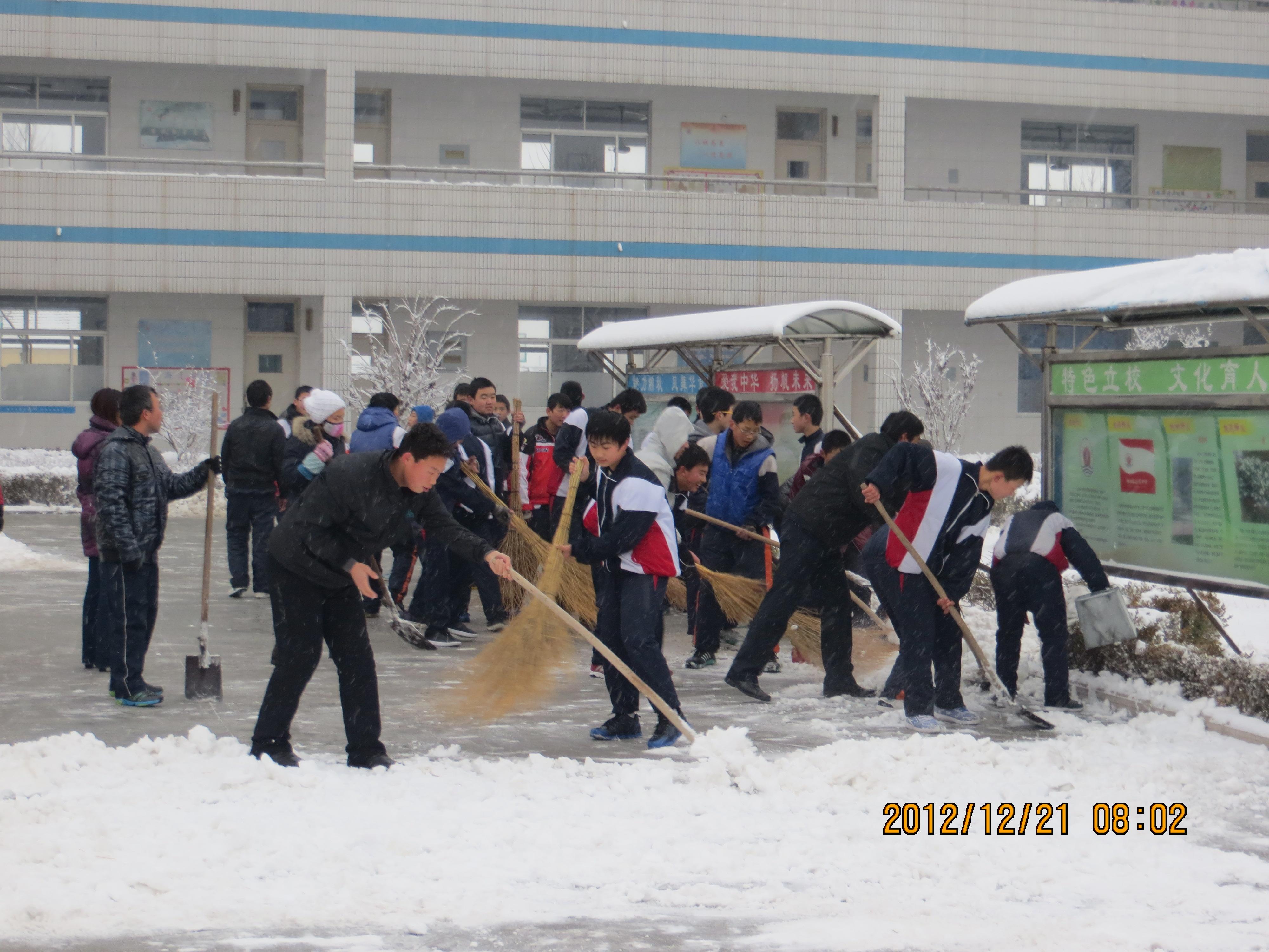 12月20日,迎来了今冬的第一次降雪,持续一晚的降雪覆盖了整个校园.为了保证师生安全,起凤中学的师生拿着铁锨、扫把等工具,在学校的主干道、教楼前后,学校门口等地方清理积雪。师生们把路面清扫的非常干净,生怕积雪覆盖的路面太滑,出现意外。通过参加扫雪活动,培养了学生们的劳动意识和集体主义精神,锻炼他们的意志品质。