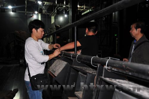 10月11日起,县文体中心主动与参加十艺节演出的湖南汨罗市花鼓戏剧团对接,妥善安排演出的准备工作。图为有关工作人员安装舞台吊杆的灯光音响等设备。 (苗娟 周城 摄)