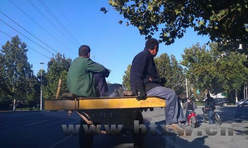 近日,在县城建设街上,两人分坐在一辆由东向西行驶的平板拖拉机的左右两侧,一人直接把腿垂下来,没有任何安全措施。本网提醒,平板拖拉机载人在人车复杂的路面上行驶,危险重重,希望驾乘者增强安全意识,珍爱生命。 (岳可华 摄)
