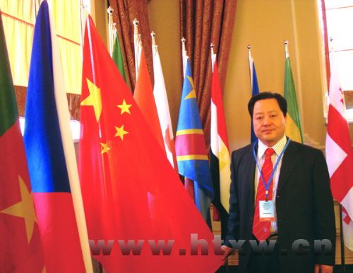伊佩庄在国外参会间隙和国旗合影