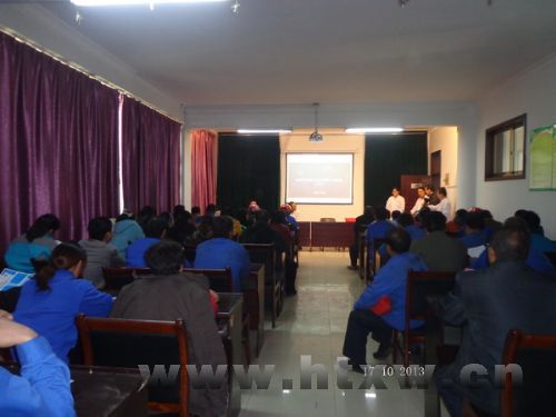 日前,周家卫生院在辖区开展“服务百姓健康”大型义诊活动,向群众普及健康和医学知识,为群众就医提供方便。图为该院健康大讲堂走进山东耀昌集团,为企业职工进行高血压防治知识健康教育讲座,并发放健康教育宣传资料。 (董兆云 耿翠叶 摄)