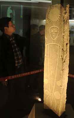 10月29日,距今7000年的“太阳人石刻”文物亮相重庆中国三峡博物馆。该石刻长115、宽20、厚12厘米,1998年11月出土于秭归县东门头遗址。石板上用阴刻线条描绘了简洁的人像,人像腰部两侧刻画星辰图案,头上方刻有带23条光芒的太阳图案。据悉,它是迄今中国发现最早的一件太阳图腾崇拜石刻文物,是三峡地区重要的史前美术遗物和珍贵的原始艺术品。