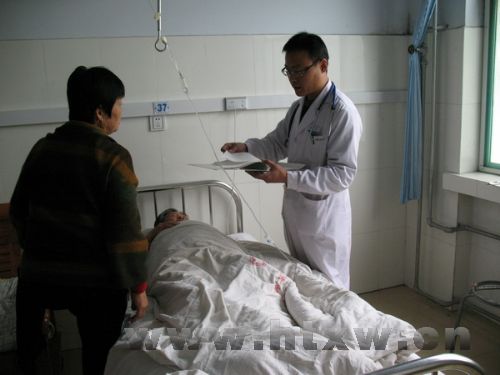 马桥镇中心卫生院紧紧围绕群众反映较多的看病不放心、不满意等突出问题,进一步转变服务理念,增加惠民便民措施,积极开展志愿者服务、出院病人随访等服务活动,进一步充实值班力量,简化就医手续,缩短病人就诊时间。图为内科主任在病房详细问诊患者病情。 (吕昌青 摄)