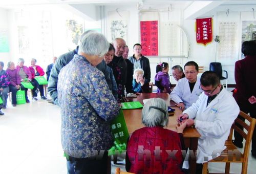 为进一步深入群众、走近患者,构建和谐医患关系,淄博圣洁医院义诊医疗小组定期到社会福利院、老年公寓、社区、镇村开展义诊活动,为患者提供更优质满意的服务。图为近日该院医护人员走进马桥镇北营老年公寓,为老人量血压、测血糖,同时开展眼底疾病检查、心脑血管病咨询、健康宣教等。 (闫涌刚 摄)