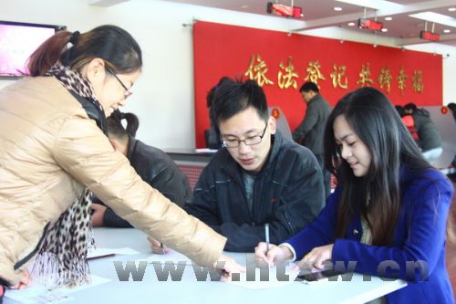 当天上午,窗外的阳光灿烂,但是县城气温偏低,然而这却并没有影响准新人们的心情。为了能在这个特殊的节日里,领取见证他们爱情的小“红本”,大家都早早地来到了县婚姻登记处。9时左右,记者在县婚姻登记处大厅里看到,一对对的情侣手拿户口薄、《申请结婚登记情况声明表》排着长龙,此时自动叫号机上面显示已有50多对准新人在等待办理结婚登记手续。
