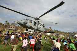 当地时间2013年11月16日,菲律宾萨尔塞多,美国海鹰号直升机向地面投送救援物资,灾民争抢。