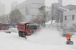 2013年11月17日,吉林降下入冬后第一场雪,环卫工人正在清理路面。吉林省多地16日白天开始的今年入冬以来首场大雪仍在持续,吉林省气象台17日下午继续发布道路冰雪橙色预警。受此影响,长春市和吉林市等地决定中小学和幼儿园在18日停课一天。