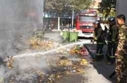 11月17日中午12时,县城建设街附近一居民小区门口的垃圾箱燃起大火,四个塑料垃圾桶顿时化为灰烬。由于风力较大,火势迅速蔓延,从此经过的一位市民迅速拨打了119报警电话,5分钟后,消防官兵赶到现场,将大火扑灭。