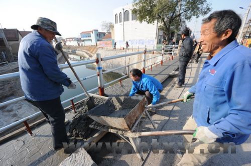 乌河起凤镇夏庄段综合整治工作自今年4月份开工,截至目前已经投资200万余元,对乌河河道进行了清淤、拓宽和加固,为乌河沿岸群众配置了标准垃圾桶。图为工作人员加固夏庄大桥及修建乌河沿岸护栏,硬化沿岸路面。