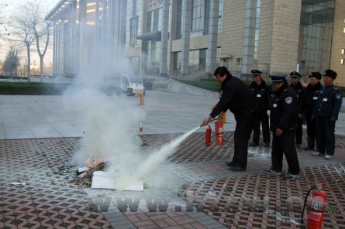 进入冬季,天气干燥,县文体中心组织开展扑火、防火技能演练,提高安保队伍的防火能力。在日常巡逻执勤中,安保队员随身配备扫帚、灭火器、通讯设备,以保证遇到突发火情能迅速处理。图为灭火演练现场。 (岳可华 周城 摄)