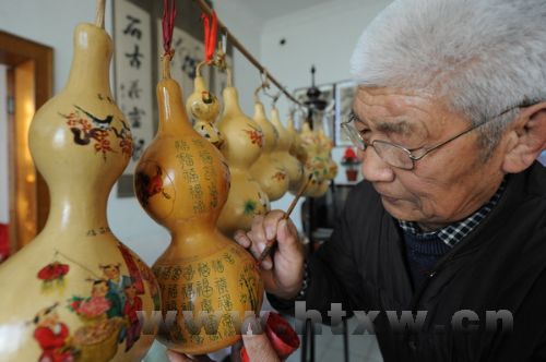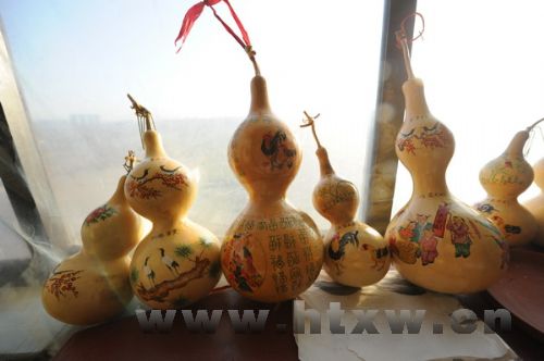 荣垂训说:“我是从去年看到电视里,说这葫芦画很好,是个吉祥物,从那就开始画。特别是一邻居张仲鹏,他种的葫芦很多,便拿来给我画。”