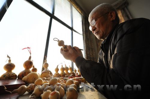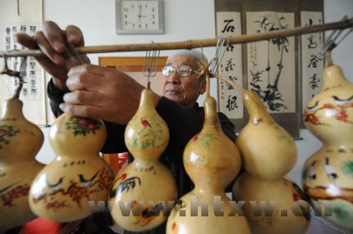 75岁的荣垂训是一个地地道道的农民,他说与葫芦画结缘,一是为了打发晚年时光,再就是葫芦所蕴含的“福禄”之意吸引着他。
