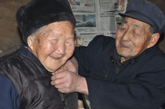 1月31日,起凤镇召开2012年度工作总结表彰大会,会上表彰道德模范。图为获得“孝老爱亲奖”的鱼二村72岁的巩绪广与98岁的老母亲巩周氏。今年起凤镇专门设立道德模范奖项,对孙秀芹、巩明方、田绪家等8名表现突出的道德模范予以表彰。 (成国栋 王桂洁 伊丽鑫 摄)