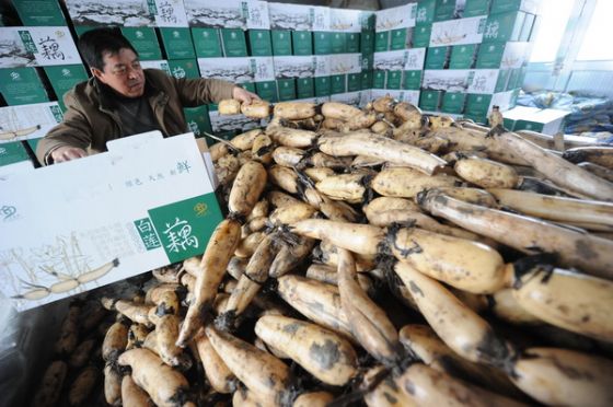 进入腊月,马踏湖区的藕池里开始活跃起来,处处都是破冰踩藕的老把式们的身影。今年,起凤镇2000余亩藕田大获丰收,亩产5000斤左右,市场供不应求。图为夏五村村民田秀泽正在择藕装箱。 (成国栋 伊丽鑫 摄)