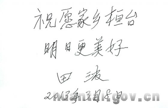 随后,田波表示想通过本报向家乡的父老乡亲送上祝福。他沉思片刻,写下了“祝愿家乡桓台明日更美好!田波,2013年3月8日”等几个遒劲有力的大字。
