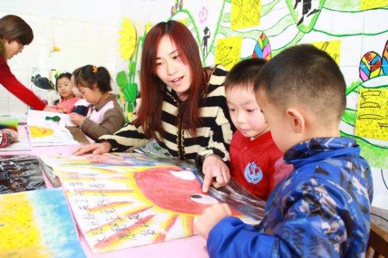 小朋友们在老师的指导下阅读绘本 (苗娟 摄)