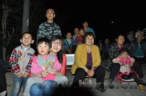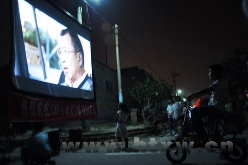 大约7:30左右,精彩的电影开始了。田孟村村委大院的大路旁,顿时变得非常安静,大家都全神贯注地随着电影故事情节的发展而沉浸在满是韵味的视觉享受中,时而会心一笑,时而闷声不语,现场气氛轻松而又紧张,大家完全融入了电影下乡的无限快乐和怀旧之情当中。前来观影的人群里有不少老人,而他们也是感慨最多的,“记得小时候一听说哪里有电影看,就是赶上好几里崎岖的小路也要追过去,一角钱买包瓜子,一角五分钱买段甘蔗,那种高兴劲已经好多年没有了……”
