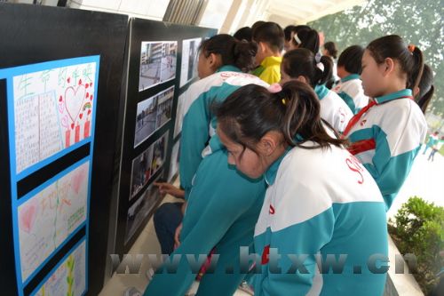 为提高学生遇突发灾害时的应急逃生能力,日前,马桥实验小学制作地震灾害图片展供学生们参观,展板涉及地震发生时的场景、地震发生时逃生示意图以及学生们针对自己对地震的理解绘制的手抄报。图为学生们争相观看地震图片展览。 (岳可华 孙涛 摄)