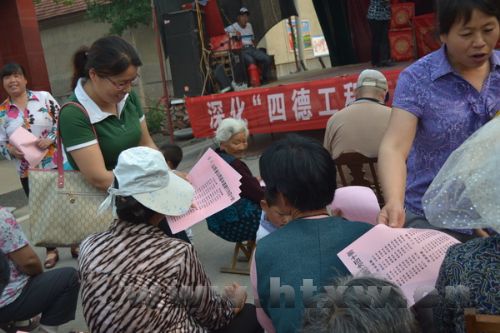 该村党支部书记张华基告诉记者:“演出中,我们为群众下发了《山东省公民基本道德行为四十则》,让群众在看戏过程中了解当前开展的‘四德工程’建设,推动我们村爱德工程、诚德工程、孝德工程、仁德工程的深入开展,努力提高全体村民的道德修养,为建设和谐田庄作出更大贡献。”
