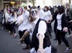 近日,英国伦敦,动物保护志愿者进行面部彩绘装扮成动物“獾”,进行“快闪”活动抗议剥取獾皮毛的行为。