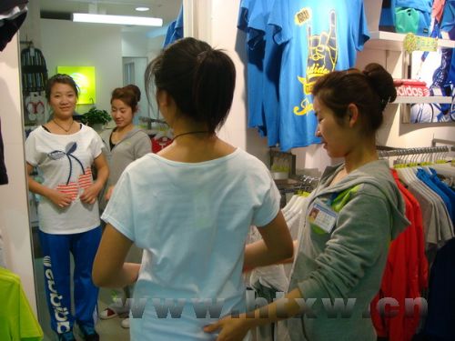 立夏过后,气温逐渐走高,市民们也体验到了初夏的感觉,夏装成了各大商场绝对的销售主力。记者在县城内各大商场内看到,连衣裙、短裤、短袖T恤挂满销售区,已难觅春装的影子。图为市民试穿夏款运动服。 (苗娟 高小龙 摄)