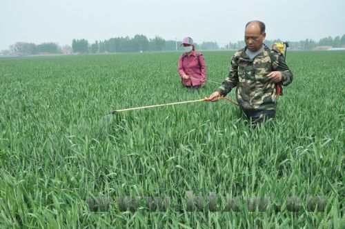 当前我县小麦已进入抽穗扬花期,是小麦生长的关键时期。为防止出现早衰,提高粒重,预防旱、涝、风、病虫、倒伏等情况的发生,我县农民积极加强麦田管理,确保夏粮丰收。图为新城镇一小麦种植户在田间进行喷药,防治小麦病虫害。 (何子强 吕建萍 摄)