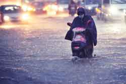 5月7日晚,长沙市营盘路,一位市民骑着电动车在雨中艰难前行。当日傍晚,长沙遭遇强降雨天气,城区多个地段出现积水内涝现象。降雨正值交通晚高峰时段,道路积水让长沙城区出现大面积交通拥堵。气象部门预计,未来两天长沙还将出现强对流降雨天气。
