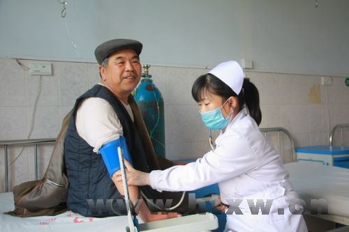 在“三好一满意”活动中,荆家卫生院不断提升护理水平,满足患者的就医需求。图为该院内科护士正在为住院患者量血压。 (伊丕香 摄)
