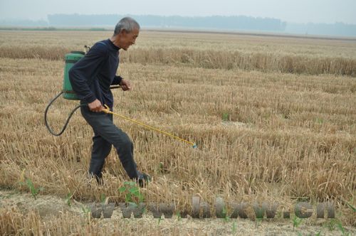目前,我县小麦收获已接近末期。广大农民正抓住有利时机,加强玉米苗期管理,及时防治玉米病虫害,确保全年粮食大丰收。图为荆家镇王明村村民喷洒杀虫剂。 (何子强 张晓萍 摄)