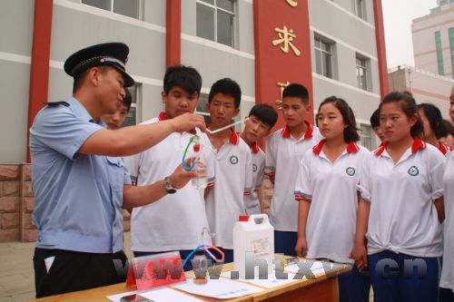 在吸毒工具的展示台前,索镇派出所民警向同学们详细介绍了收缴的部分吸毒工具。“咱有时候抽烟,抽一支扔了,一辈子可能不再吸了,但是冰毒只要你吸一次就可以成瘾。所以大家一定要远离冰毒,远离毒品。”县公安局刑侦大队一中队民警王强介绍说。