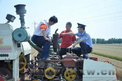 为确保麦收期间安全,控制和减少各种火灾事故的发生,县公安局抽调精干民警赴各镇,深入田间地头开展麦收防火知识的宣传教育活动。图为民警在果里镇三龙村为农机手王士刚讲解麦收期间防火防盗知识。 (何子强 陈洁琼 摄)