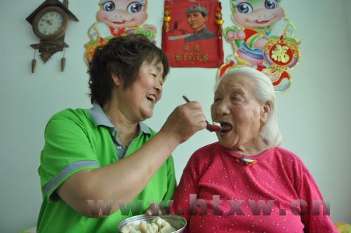 近日,唐山镇宋店村村委与少海托老所联合出资120余万元,将闲置的旧村委大院进行翻新扩建,建成了一座可容纳150名老人居住的现代化托老所“福寿居老人乐园”。图为托老所工作人员照顾一位百岁老人吃水饺。 (何子强 隋国萍 摄)