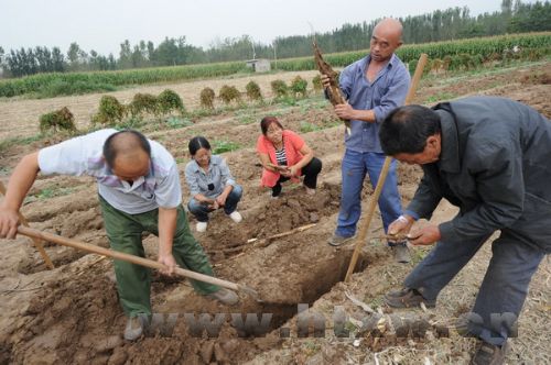 9月16日,新城镇河南村村民们正在忙碌着收获细毛山药。据了解,今年的山药比往年提早上市近半个月。赶在了“两节”之前,有望卖个好价钱。