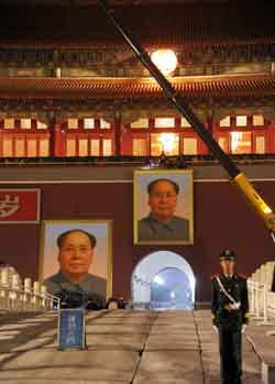 2013年9月28日零点,天安门城楼开始了一年一度的更换新的主席像工作。工作人员用吊车把旧的毛主席画像徐徐钓了下来,再把新画像吊起来固定在了城楼正中央。整个安装过程仅用了一个小时。按照惯例:天安门城楼悬挂的毛主席像每年至少要更换一次。毛主席像高6米,宽2.5吨。