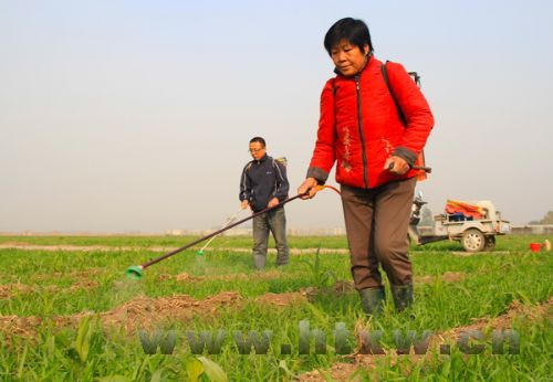 11月5日,记者在索镇王沟村看到,村民张士玲正在麦田里喷施除草剂,确保明年小麦丰收。村民们抓住近期适宜天气,抓紧进行田间管理,进行田间除草。 (李凯 摄)
