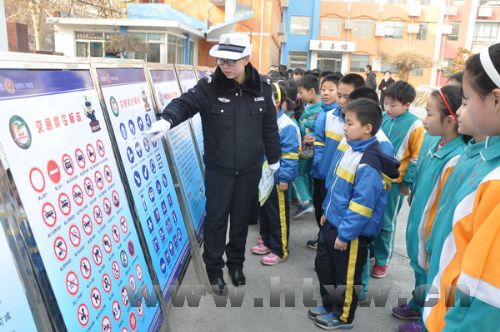 为进一步提高学生的文明交通安全意识,牢记交通安全法规,2月20日,桓台交警大队民警走进县实验小学,采取上交通安全课、讲解宣传挂图和展板内容等多种形式,开展交通安全进校园宣传教育活动。图为民警在交通安全展板前为学生讲解交通安全知识。