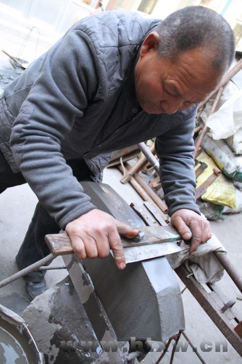 伊茂会今年68岁,打了一辈子菜刀,从16岁当学徒开始,一晃已经50余年,是个名副其实的“老刀夫”。记者在他的工作间看到,里面摆满了空气锤、磨刀机、切割机等工具。伊茂会告诉记者,门口摆着的那堆“破铜烂铁”经过这些工具的磨练,最终都会变为一把把锋利且美观的菜刀。把铁块和钢块变成一把锋利的菜刀并不是一件容易的事,前后需要近10道工序才能完成。每道工序都有严格的要求,需要长时间的学习才能掌握。