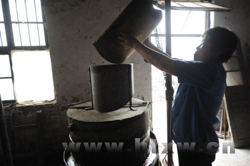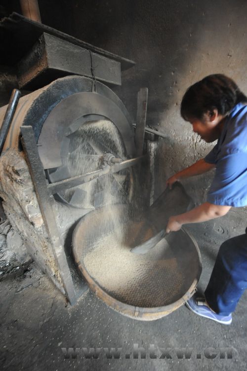 在“水代法”制油的整个工艺流程中,炒芝麻和兑浆搅油是最关键环节。芝麻一定要炒得恰到好处,兑浆搅油时加多少水则直接关系到香油的品质和出油量。“水加多了加少了都不行,差一茶碗水,就可能出不了油或者少出好几斤油。加多少水、炒芝麻火候的掌握全凭经验,各个环节都要一丝不苟,烂熟于心,灵活运用。”周林明说。