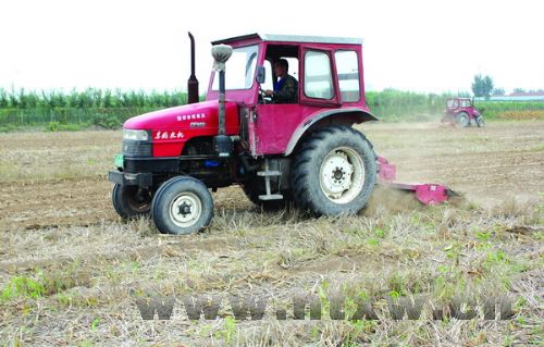 日前,果里镇姜坊村一块玉米田里,农机手驾驶着安装有旋耕机的大型拖拉机在旋耕土地,为小麦适时播种做好了准备。