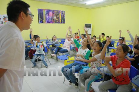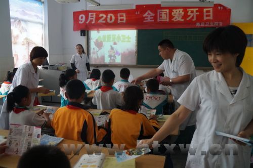 9月20号是全国爱牙日,我县医务工作者深入各学校,开展口腔保健知识讲座。左图为马桥镇陈庄卫生院医护人员走进陈庄小学开展讲座;右图为桓台佳美口腔医院医护人员到淄博国际语言学校,讲授口腔保健知识。 (伊丕香 岳可华 何晓明 摄)