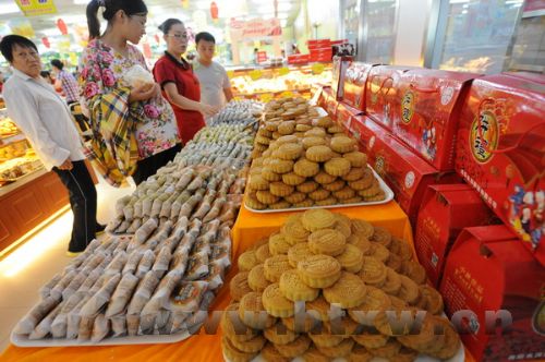 中秋临近,县内各大商场、超市无一例外把“中秋”作为促销主题,将中秋元素融入商场布展的各个角落,营造出浓浓的节日气氛。记者注意到,比起盒装月饼,零售月饼更受消费者青睐。图为喜乐佳购物广场设立中秋节月饼专柜,方便市民购买。 (成国栋 摄)