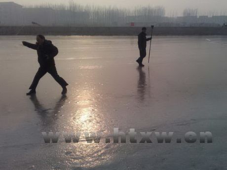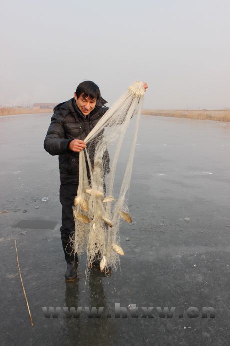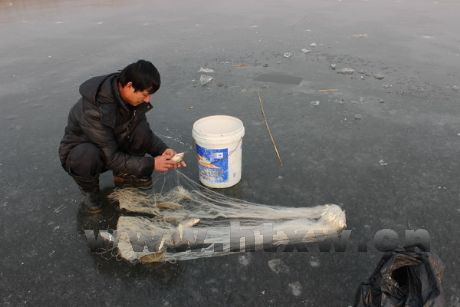 1月9日,记者在马踏湖东部的环湖河道里,看到了马踏湖区的传统捕鱼方式——冰上捕鱼。今年冬天的天气虽不算太冷,但环湖河道里已结了一层厚约十公分的冰。湖中的鱼虾因为缺氧,喜欢贴着冰层游动。捕鱼人打开一个冰口,用竹竿放进一个“粘网”,鱼儿只要钻进了“粘网”,就会被紧紧缠住。捕鱼人只需牵着渔网慢慢拉上来,粘在上面的鱼就会活蹦乱跳地跃出水面。捕鱼人只要大一些的鱼,小鱼会放归河里。现在湖区的各种野生动物已经得到了很好的保护,随意捕杀鱼类的行为已经被禁止。但在冬季闲暇时光,在远离湖中心的河道里,湖区人仍喜欢用传统方式捕鱼,不仅仅是为了享受餐桌上的佳肴,更是传承流传已久的湖区文化。